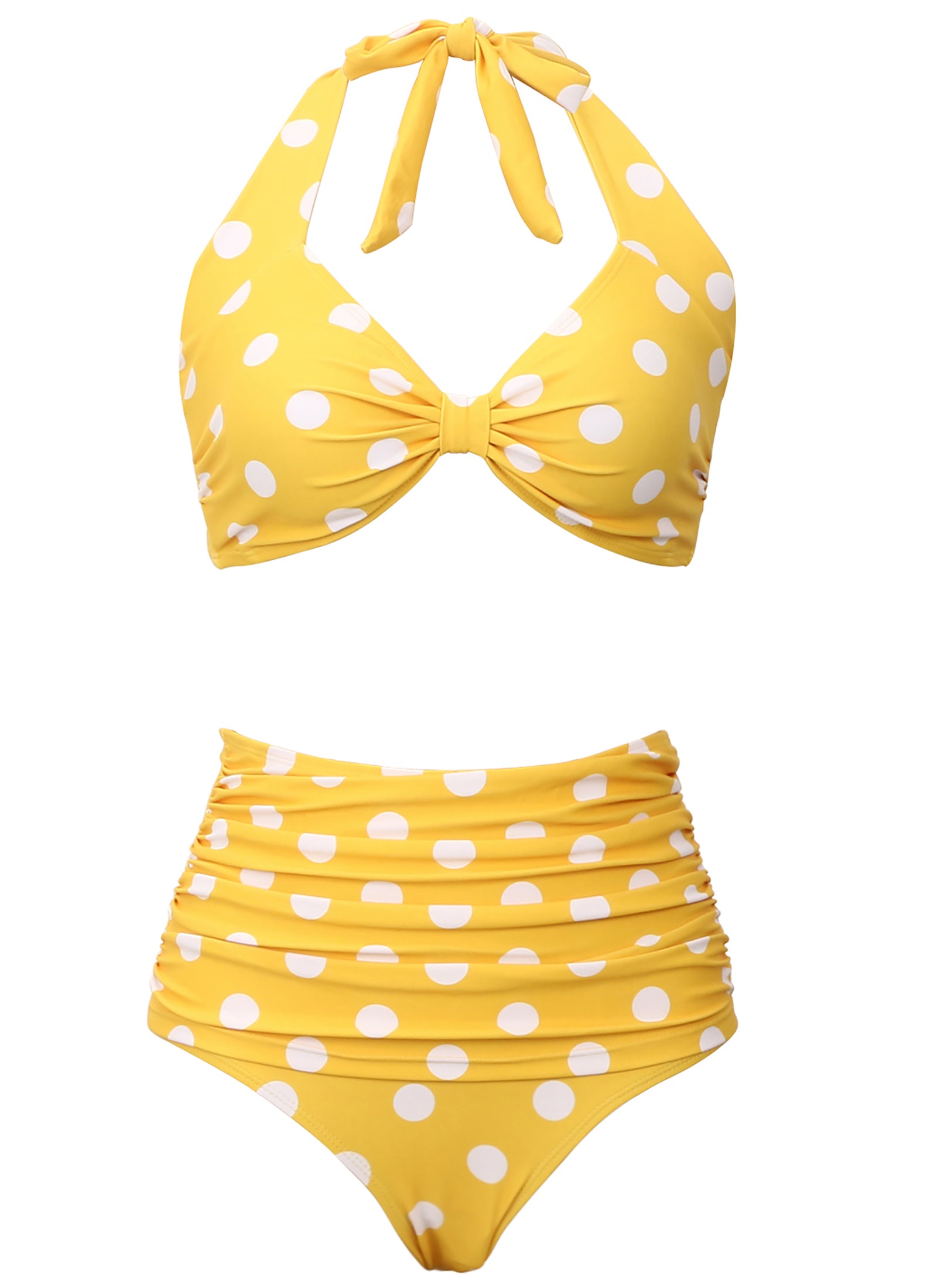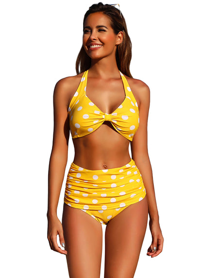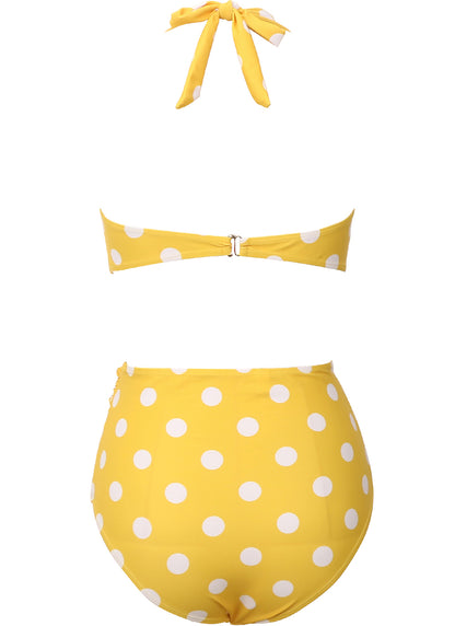 Vintage Halter Knot Yellow Polka Dots Printed Bikini Set